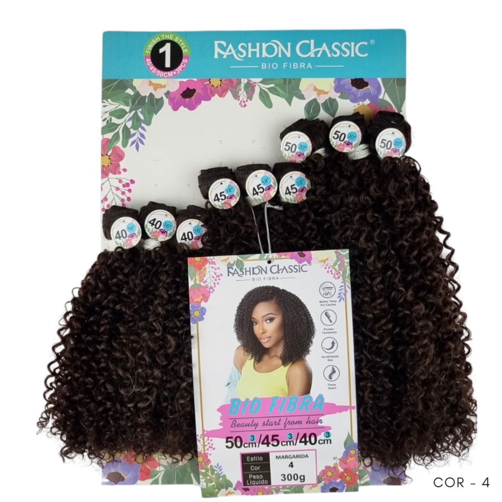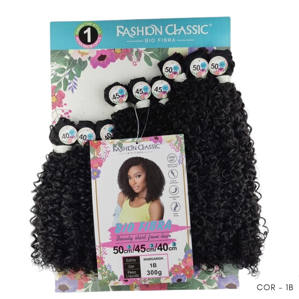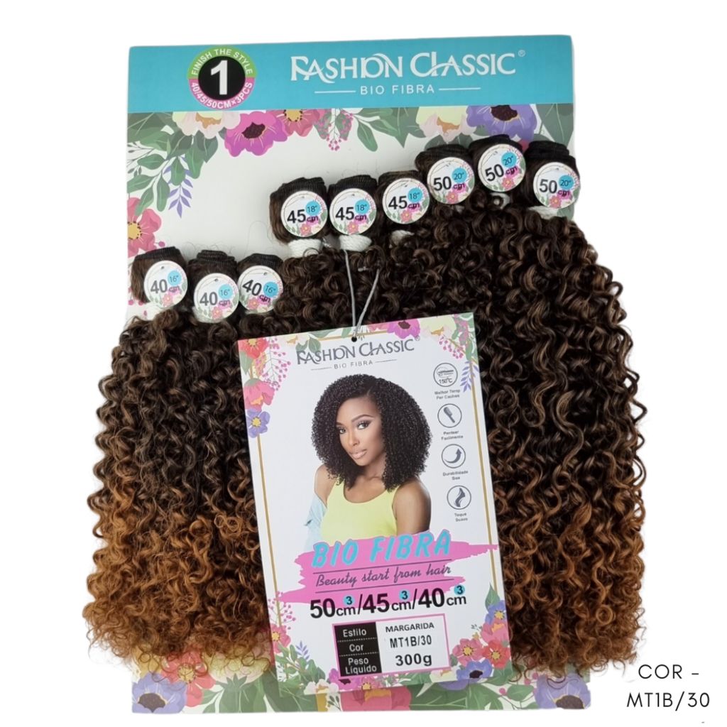 O cabelo MARGARIDA-Fashion Line tem cachos fechados e definidos. Ele é de Bio Fibra, compondo a coleção Fashion Classic, e é ideal para entrelace. Em cada pacote contém 9 peças que variam entre 40cm/45cm/50cm que totalizam em 300g